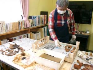 郷土資料館では、数年前から、大中遺跡出土遺物の洗い直し作業を継続して行っています。その戦力となっているのが、ボランティアさんです。