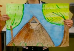 昨年度は「低学年の小学生」対象でしたが、今年は学年の制限なしで参加を募りました。2・3・4年生の子どもたちが、復元竪穴住居の見学をして写生をし、絵の具を使って作品を仕上げました。