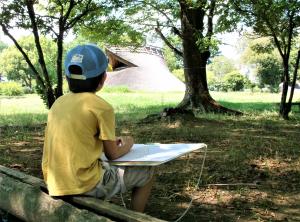 大中遺跡公園の中で、復元住居の絵を描きましょう。木々の緑が美しい季節に、外で写生をします。