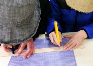 カッターナイフで材料の板をカッターナイフで切ります。