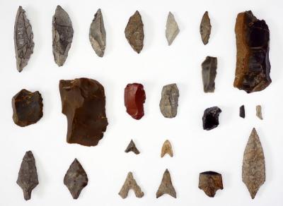 これらの資料は1964(昭和39)年から1974(昭和49)年までの11年間にわたり、大中遺跡(播磨町大中)及び山之上遺跡(加古川市山之上潰目池)において、微細なものまで丹念に採集された石器です。